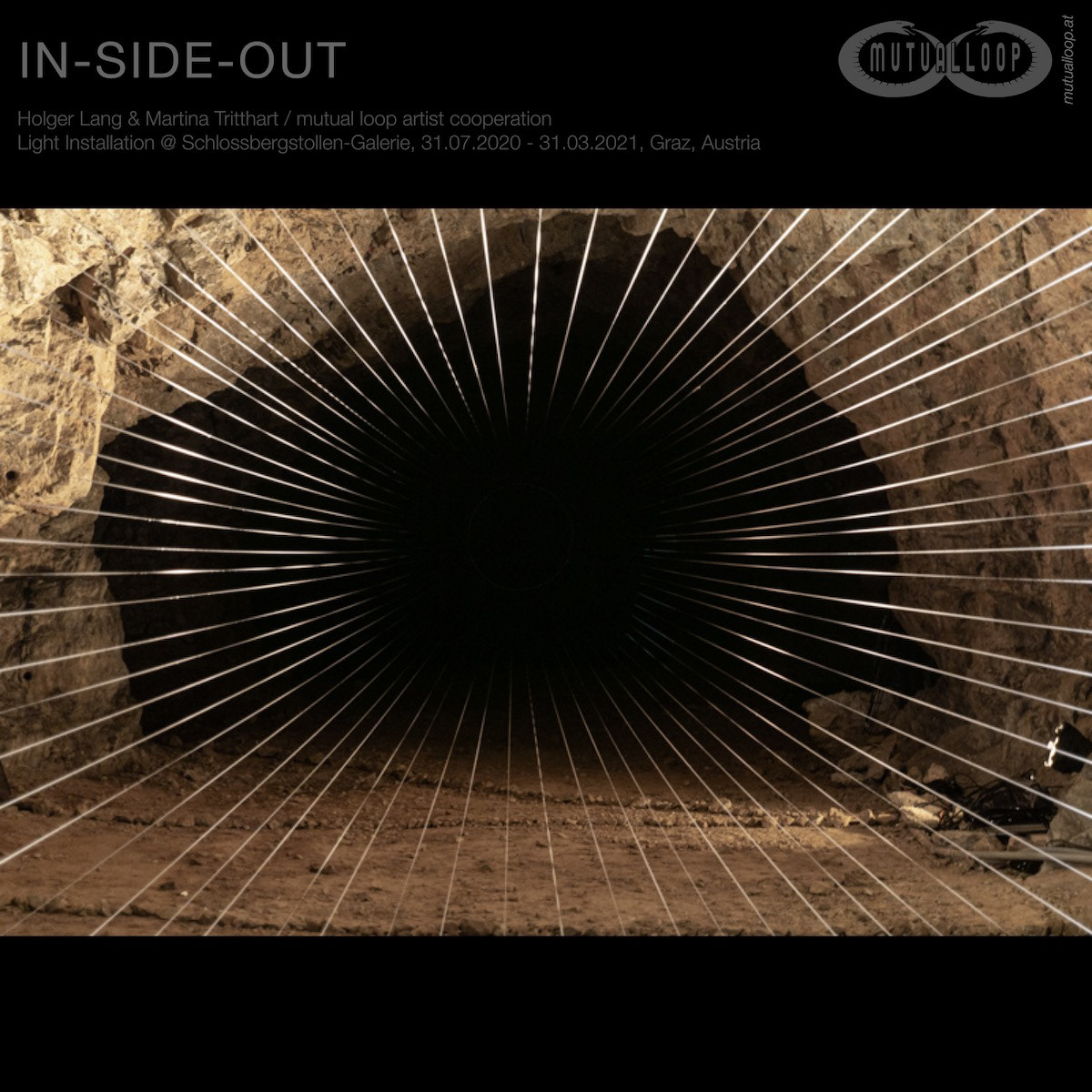 IN-SIDE-OUT was part of the project SOLARIS curated by "mehr licht" in Graz, Schlossbergstollen-Galerie. Based on the novel by Stanislav Lem "In-Side-Out" questions the alien in ourselves. A tube of vibrating lines within a tunnel that has no visible end is a metaphor for diving into the ocean of the unconscious, into the secrets of our own identity, in which we become strange and eerie to ourselves. The path into the unknown and unexplored within our souls can only be taken slowly. The whole picture will never be fully visible. Like a dark sun, the far end of the corridor reflects the transition into what is hidden inside the world that we know. Light and matter lead us into the depth of the mountain and at the same time into the depth of memories of our adventures, experiences and the impressions that we have gathered. We stretch a bright thread that can figuratively bring us from the underground back to the daylight of our consciousness. This connection builds the tunnel that links us with the hidden, with the darkness and the mysterious inside us.