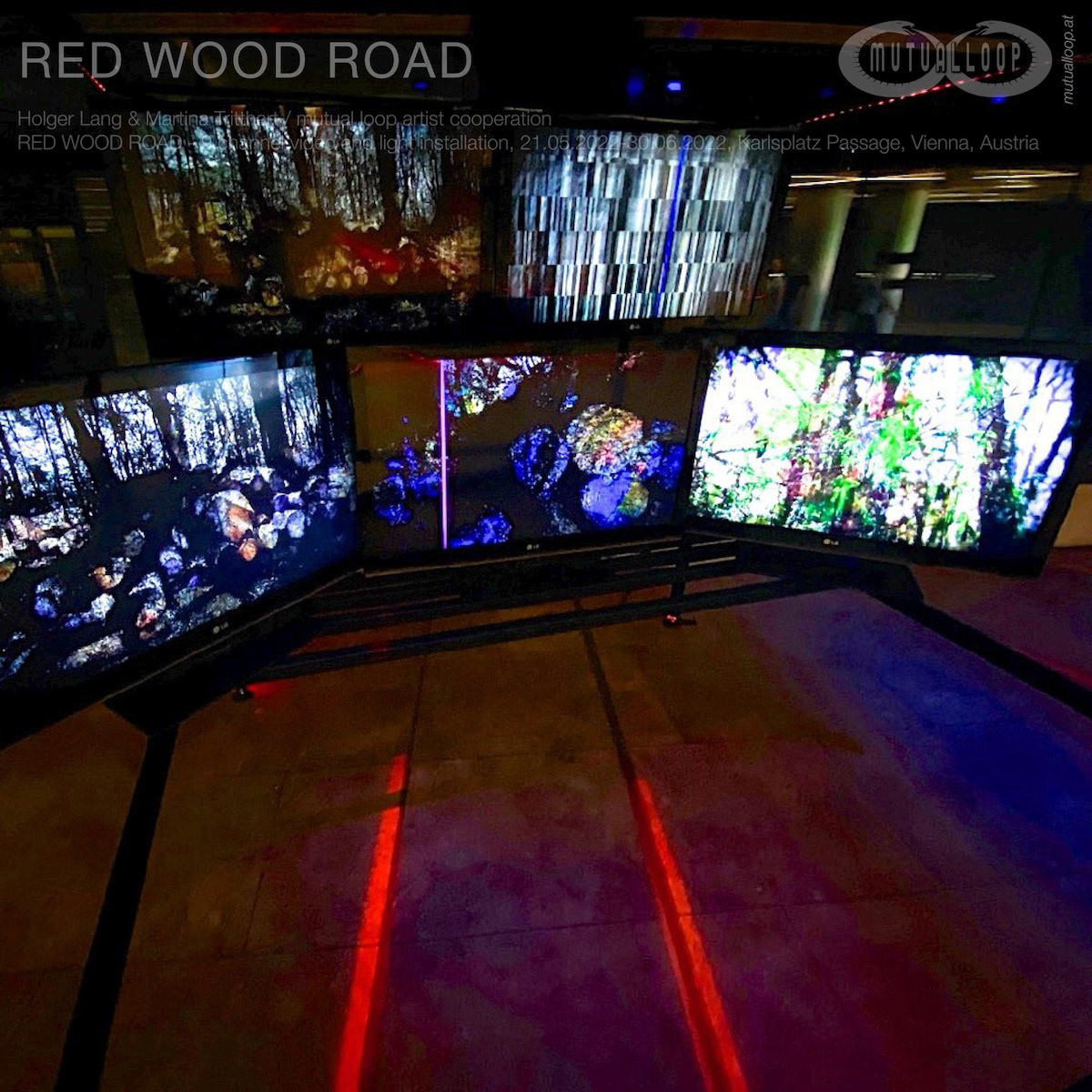 RED WOOD ROAD - 9 channel video and light installation, from May to June 2022 at the ‚Red Carpet Showroom‘ in public space at Karlsplatz Vienna featured by Künstlerhaus. Set up with the help of Bernhard Meißnitzer and the team of Künstlerhaus: Pete Gmachl, Vinzent Cibulka and Gerald Roßbacher. Trains, buses, cars, bicycles and pedestrians meet over several levels at one of Vienna’s busiest transport hubs. In addition, trees, meadows, flower beds and bodies of water invite you to linger, rest and dream. The contrast between urban movement and the relaxing power of nature can hardly be greater than in this place. Video loops on spatially arranged screens and a slowly running light sequence pick up on these opposites and continue them reflected in the showroom. Vehicles move through the city in patterns that always appear to be the same, along lanes and lane markings. Bushes and trees, in turn, create counterpoints in the visual composition. A red line not only leads through the underpass, it also connects the street with a virtual undergrowth in which a stylized jungle also dissolves into shapes and structures. The question of a confrontation between the challenges of traffic in the urban environment and nature itself, as a synonym for a possible different way to each other, is discussed and negotiated aesthetically in this work. However, it is not about presenting a simplified position on either city or country, on traffic or forest, but about presenting what connects and complements each other.